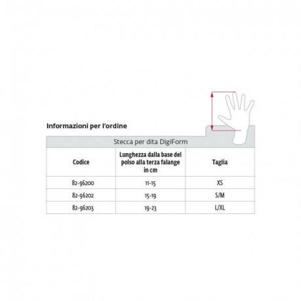 • Lunghezza tutore: 19 cm (XS), 23 cm (S/M) e 27 cm (L/XL)